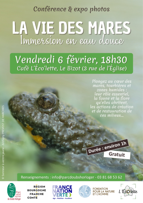 Le Parc naturel régional du Doubs Horloger vous invite pour une immersion au cœur des mares, tourbières et autres milieux humides. Au cours de la soirée, découvrez leur rôle fondamental et pourtant méconnu, les espèces qu’ils abritent, ainsi que les actions de création et de restauration de mares... L'exposition photos « Écailles et mucus » sera également présentée, au sein du monde discret et fascinant des reptiles et des amphibiens.